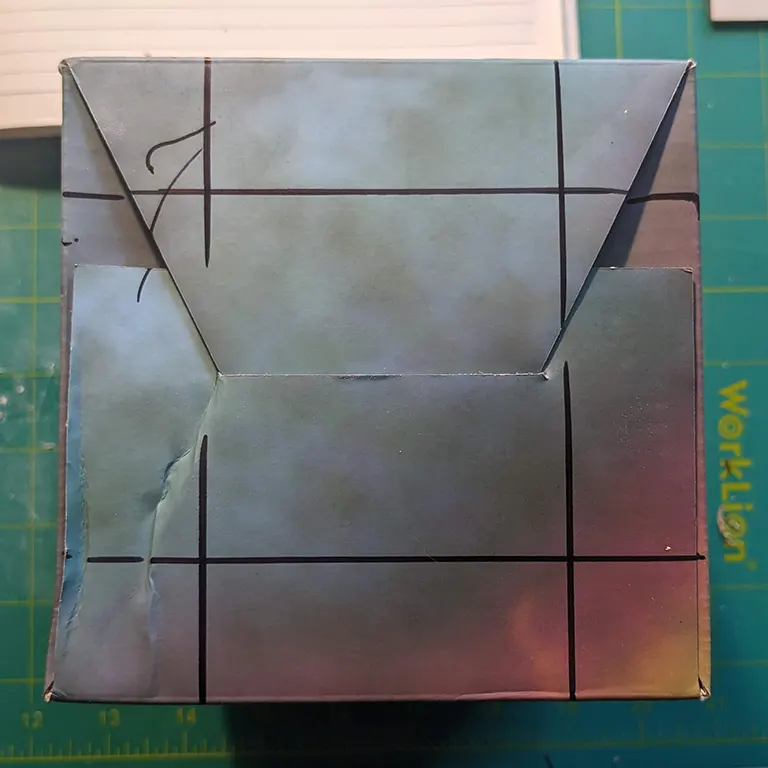 I like to keep bits of packaging1 that I think have potential as useful crafting materials. One such hoarded item was a squat oblong box, with a square footprint. Not that uncommon but unusual enough for me to hang onto it. The idea initially came from my partner; to build an open four-sided structure with an archway on each face - I liked it as a concept for a piece of terrain because it can allow line of sight through, and can have minis placed both underneath and on top.