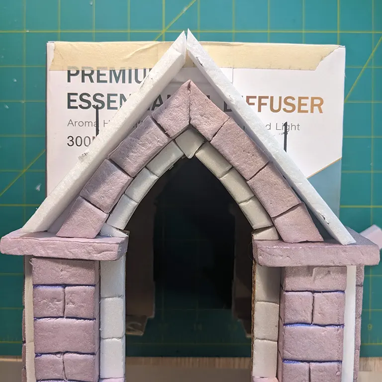 The pillar facades were roughly measured and cut as a single strip from 1” insulation foam. The brick outlines are marked and scored several times with a biro, softening the edges with the rounded tip. Then a balled up piece of tinfoil is used to texture them. So easy! All brickage in this project is done in basically the same way.