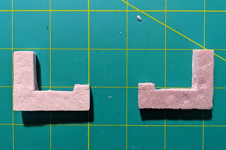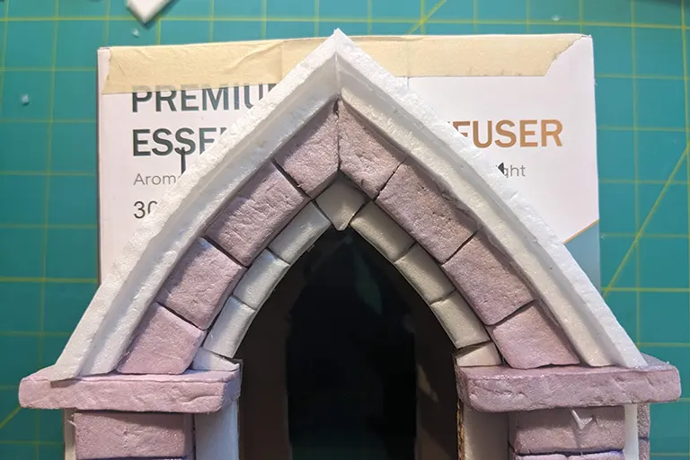 While the shapes I was adding were simple, enough variety helps to sell the look that this could be a real stone structure. Using two kinds of foam helped too: the pink stuff is from a 1” slab of XPS insulation foam while the white bits are from a less dense, ‘dollar store’ 1/4” hobby foam sheet.