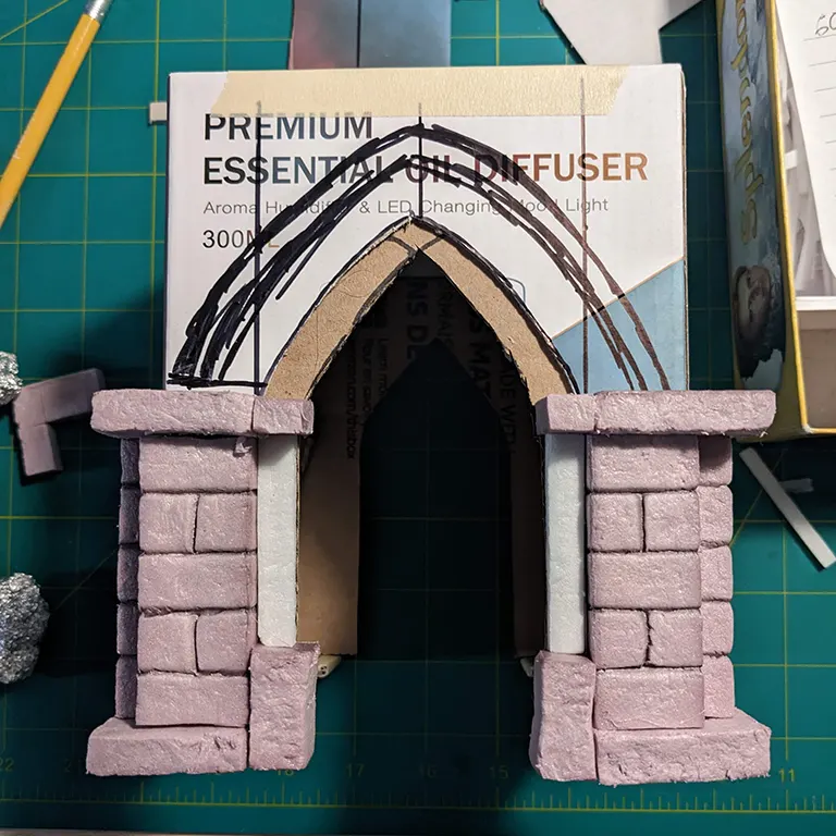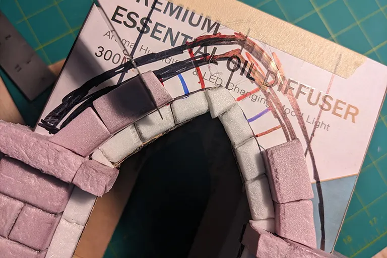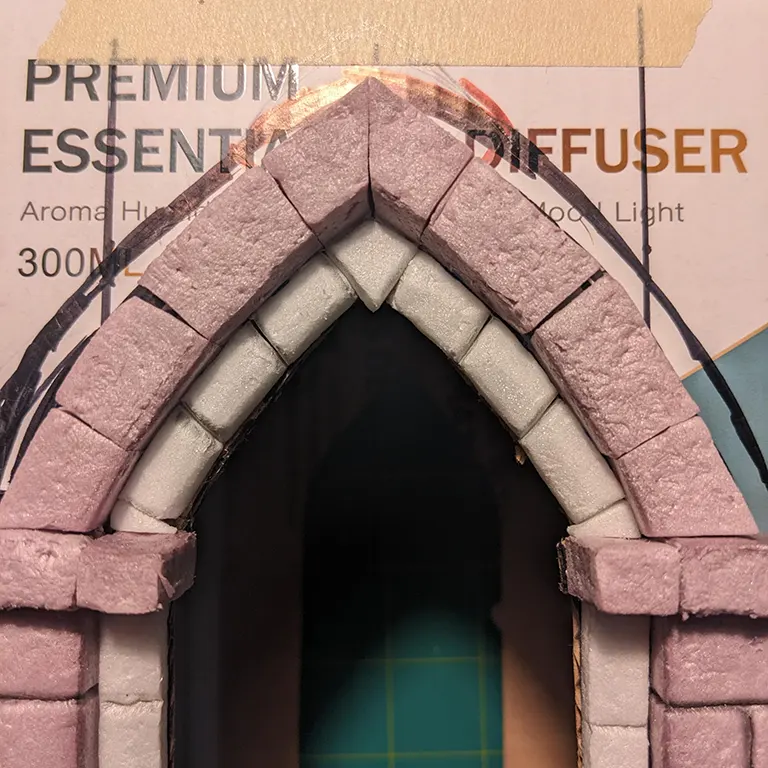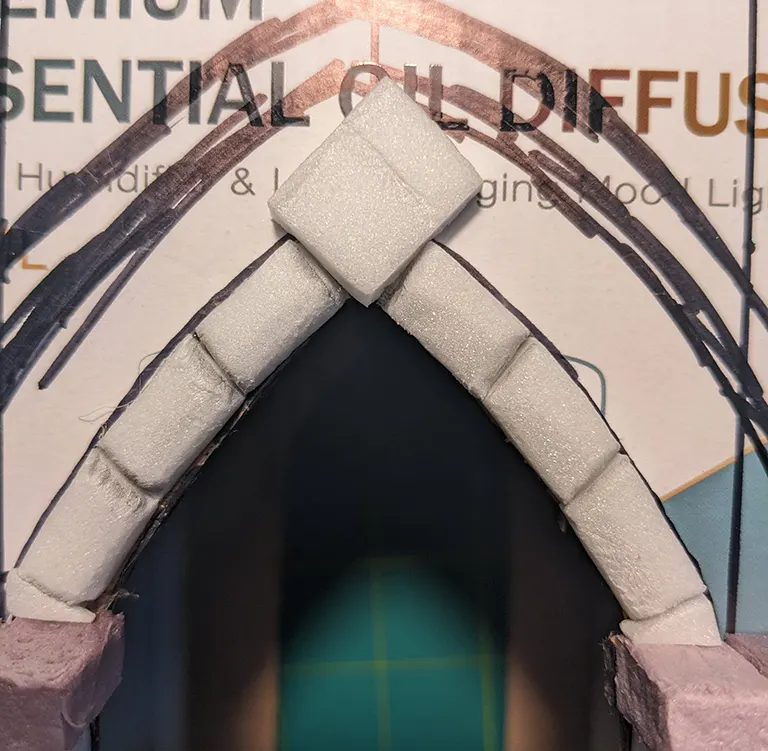 The last step for the first side was to trace the current arch onto the hobby foam and cut out a facade for the rest of the brickage. Using a ruler for the horizontal scoring and totally freeballing it for the vertical brick lines..