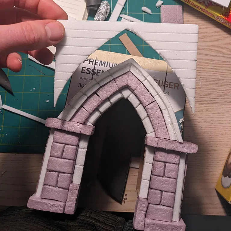 Remembering that layers are everything, I cut out a smaller archway from a flat piece of card and glued this inside the main box - adding some variety and depth to the surface before we even begin to put foam on the piece. I could have just made the foam thinner in these places but I think it also helped as a guideline for the ‘exploratory’ process that I was undertaking.