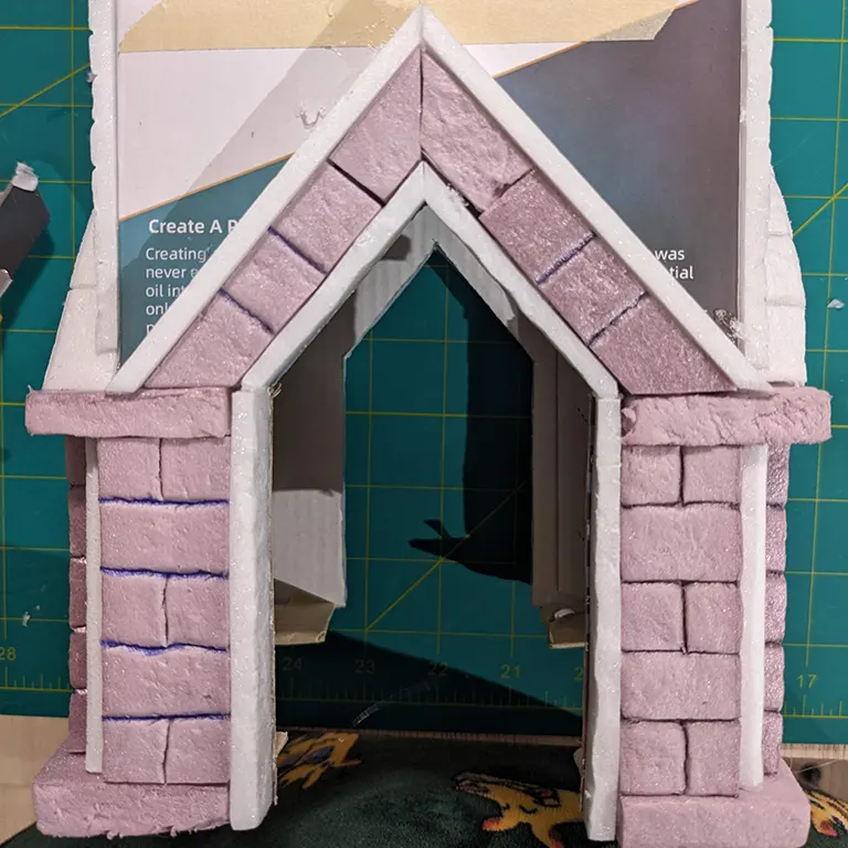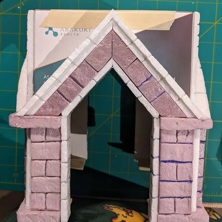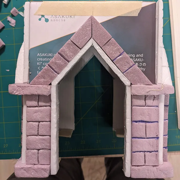 The pink, thicker foam bricks were a lot easier to get sized up for the two sides of the arch as there were no curves! Then I glued on another pair of white foam strips on the upper side of the pink arch bricks. It was already looking great, but remembering the key rule for making realistic arches - Layers - I slapped on a second piece of white foam. By making i slightly thicker than the first one it instantly added that depth I was looking for. Although there were less levels of depth overall on this design, it still had enough visual interest in my eyes.