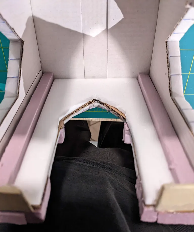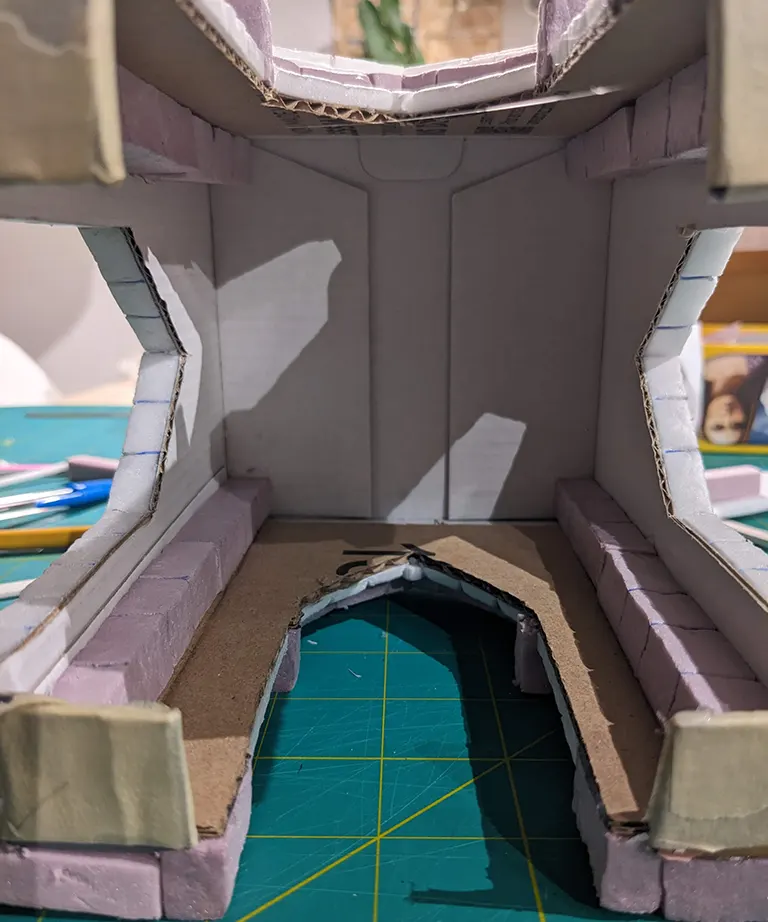 After inserting and glueing this floor/ceiling bit in I was really starting to feel accomplished! The piece was really getting some weight and heft to it which made it feel more substantial. Despite being an amalgamation of insulation foam, hot glue and cardboard it was almost.. art?