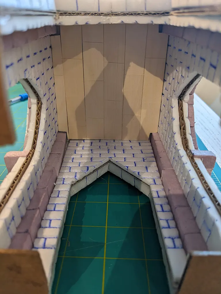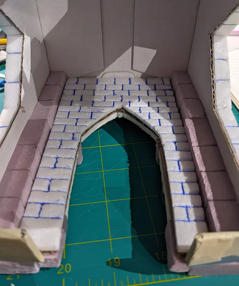 Instead of the inset I created on the first arch design, by glueing a strip of card with a smaller arch of the same shape inside, the second design was flush to the surface of the pillars. I added interest with thin, flat strips of foam glued on the inside of the pullars and scored it to make it look like brick panels. This design was continued on the inside of the archway itself.