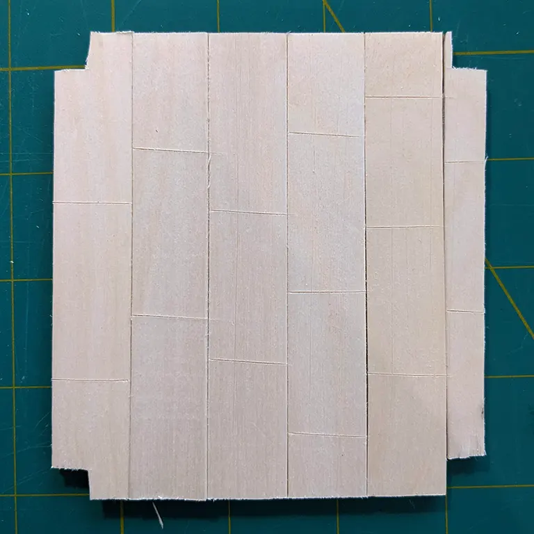 However I was crazy enough to realise that even though no one would ever see the underside, I wasn’t happy with just plain cardstock there. So I glued lollipop sticks onto the surface, scored where planks might line up on a wood floor and cut the corner shapes.